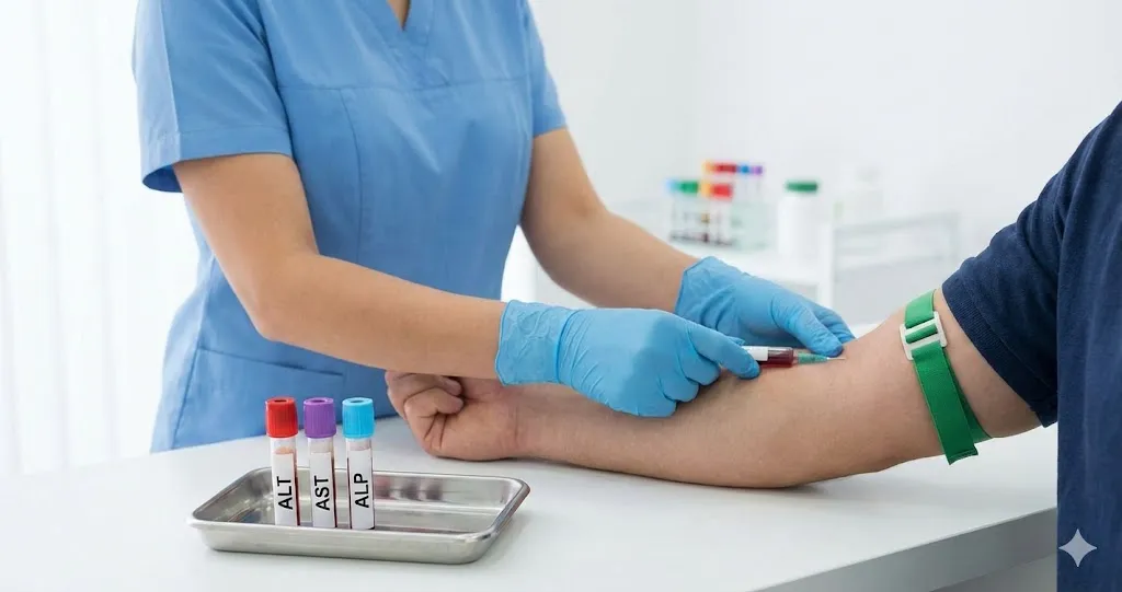 - آزمایشهای عملکرد کبد : مجموعهای از تستهای خونی که آنزیمها، پروتئینها و بیلیروبین را اندازهگیری میکند.